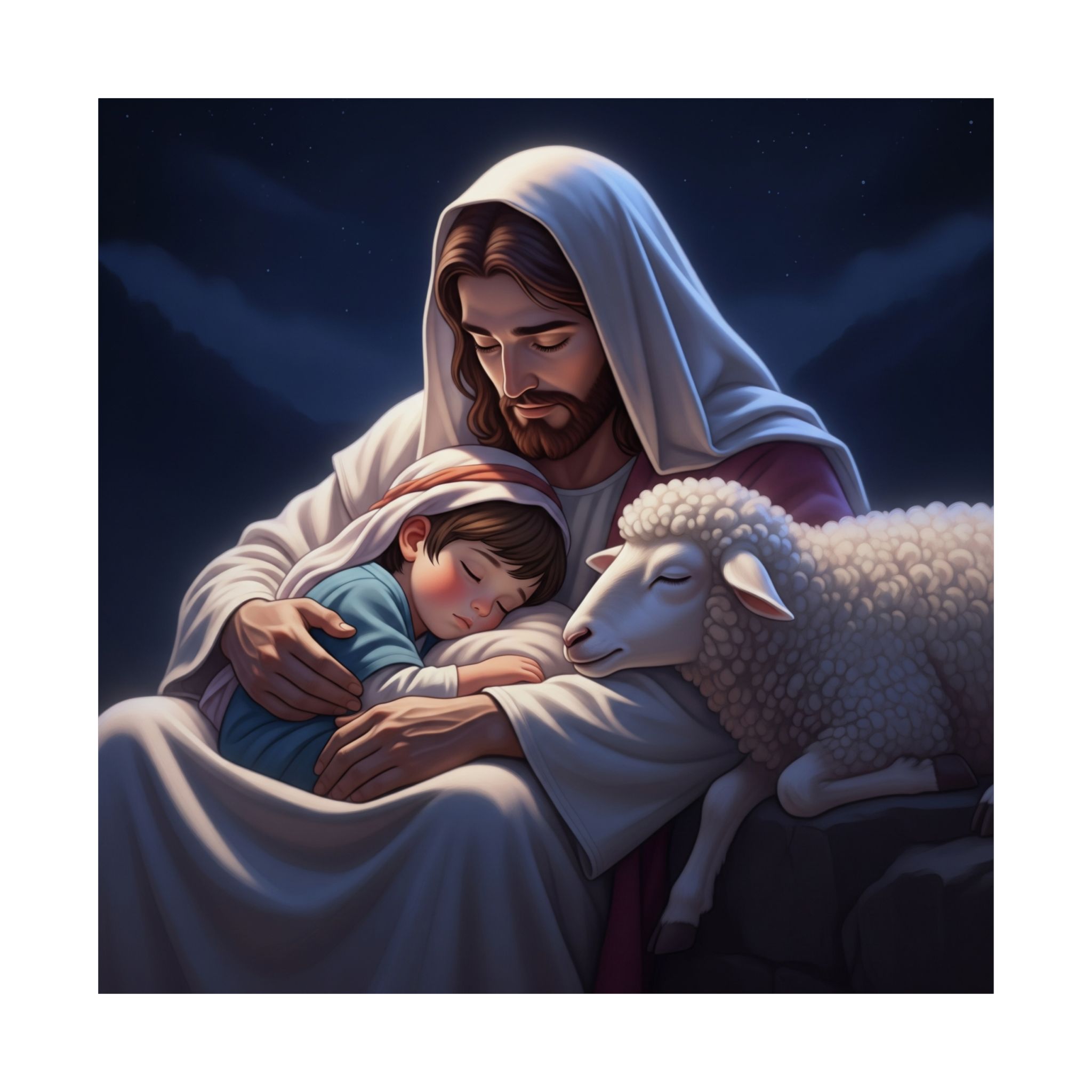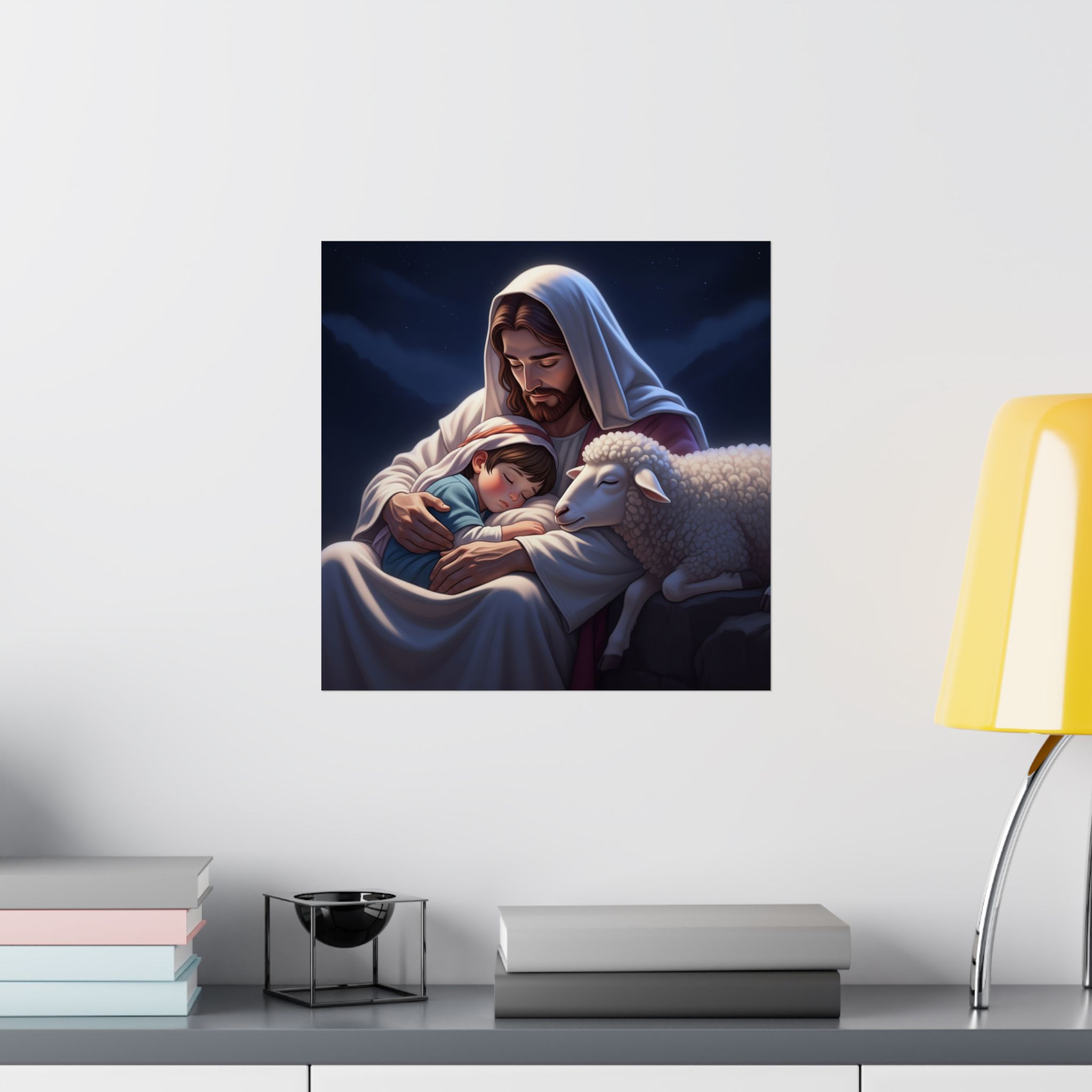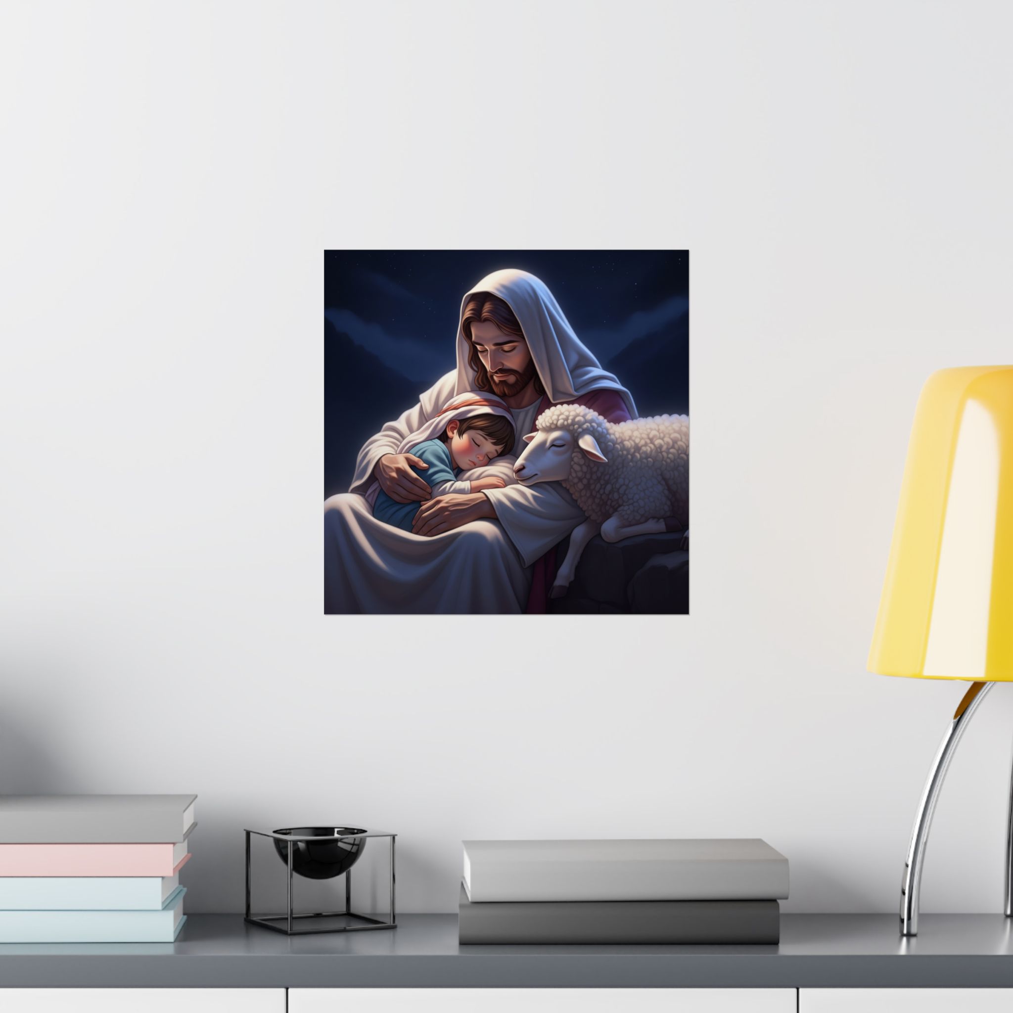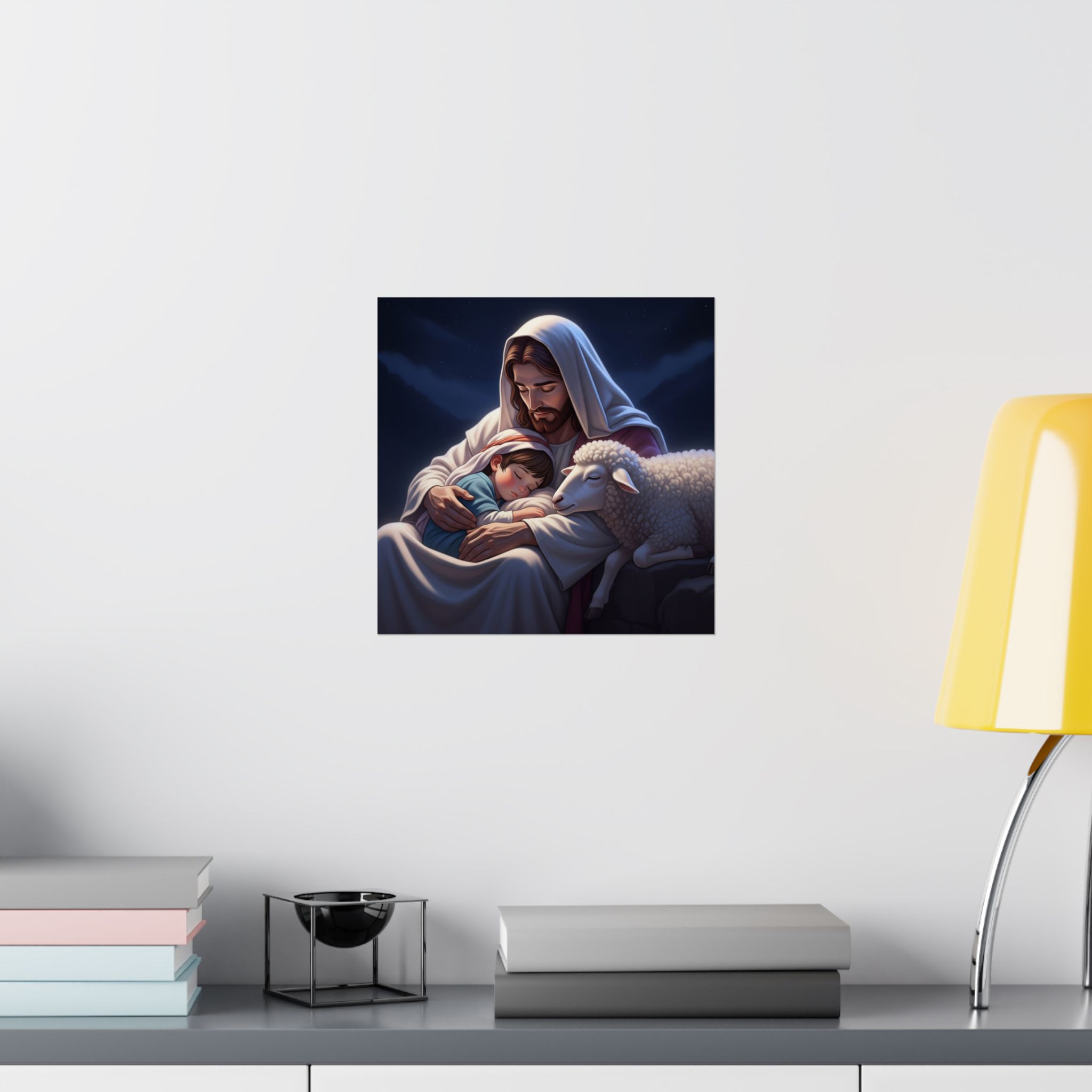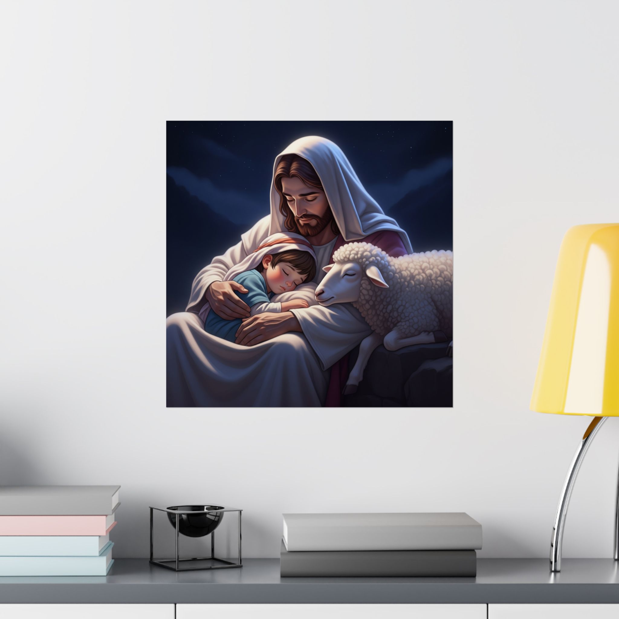 Transformeer je ruimte met deze prachtige matte verticale poster die warmte en sereniteit uitstraalt. Het prachtig vormgegeven ontwerp is vol compassie, liefde en bescherming. Deze poster creëert een vredige sfeer, waardoor ze perfect is voor een slaapkamer of andere kinderruimte. Of geef het als een attent cadeau. Ideaal voor kerkelijke gebeurtenissen en vieringen.    Producteigenschappen…